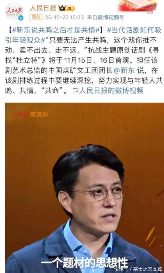 在抗日主题话剧《寻找“杜立特”》的宣发现场,靳东讲道。 “无论什么题材,只要无法与观众产生共鸣,这个戏就推不动,走不远。”